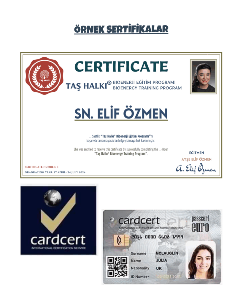 - Taş Halkı® tarafından hazırlanan fotoğraflı Bioenerji Eğitimi sertifikası.